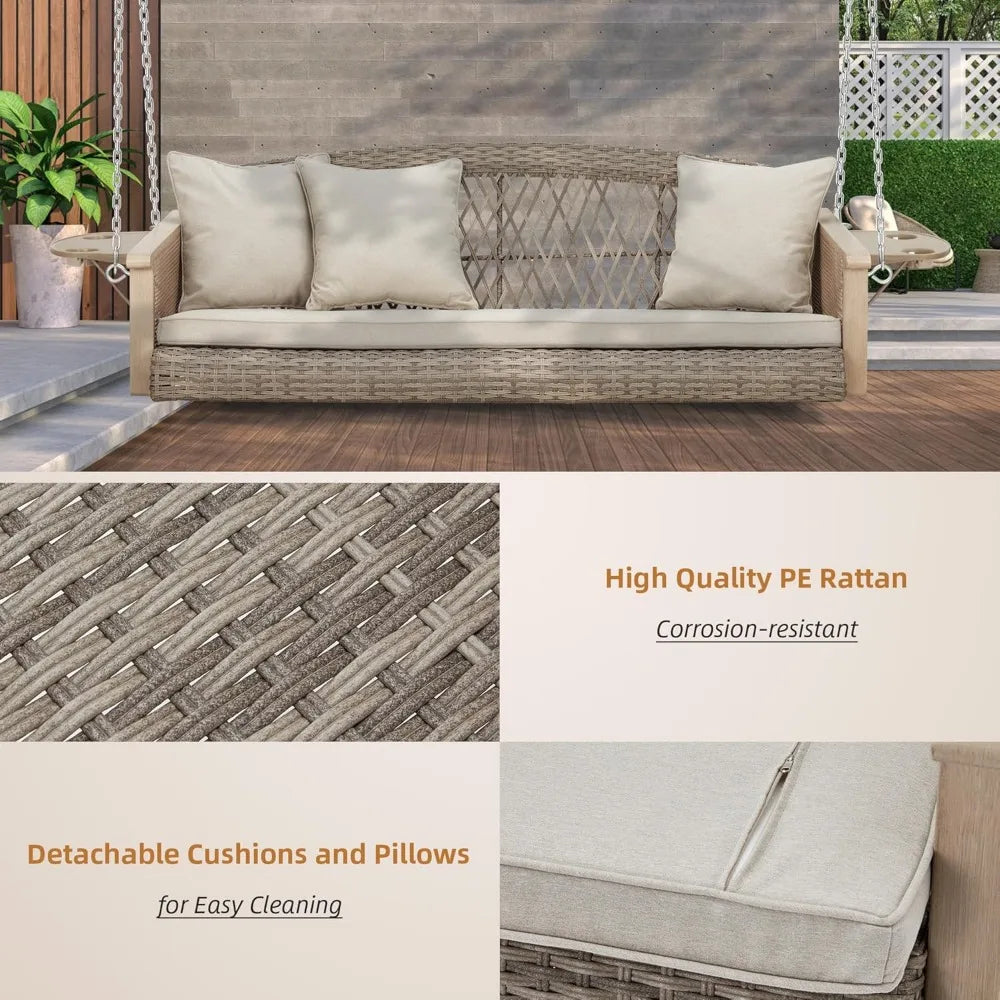 3-Person Wicker Porch Swing with Upgraded Cup Holder, 55 Inch Patio Hanging Swing Bench Chair with Cushions 900lbs Capacity