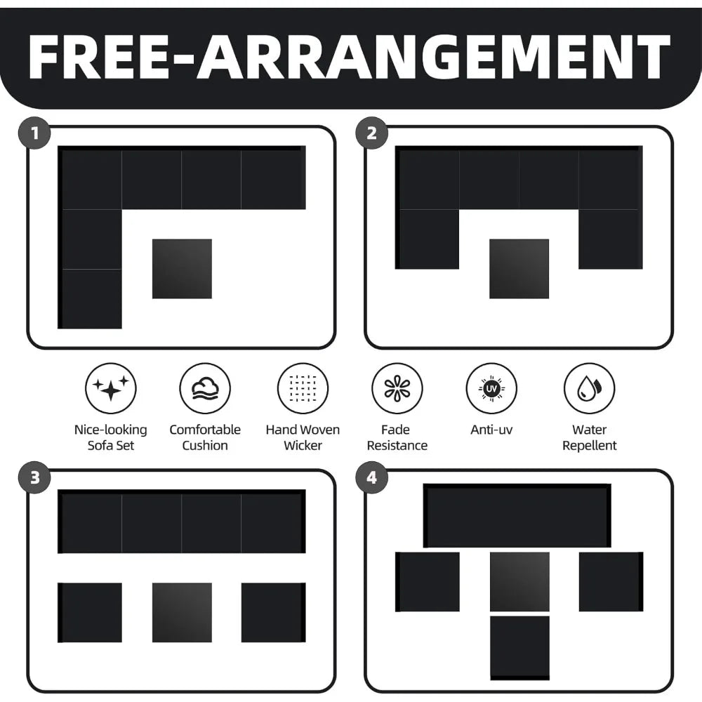 - Enhance Outdoor Comfort - Indulge in luxury and sophistication with our 7-piece patio furniture set, boasting a sleek and modern hand-woven sofa base paired with sumptuously soft cushions. Our cushions are thoughtfully designed with zippered covers, guaranteeing effortless maintenance and timeless grace.