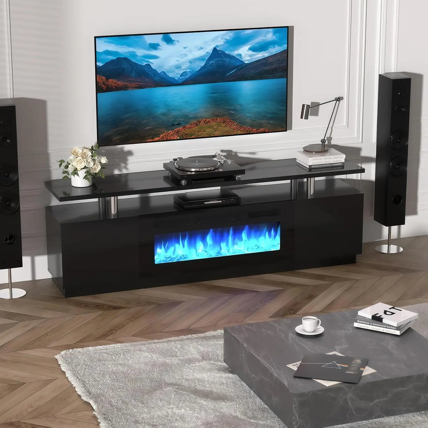 - 【2-in-1 Versatile Design】 70" fireplace TV stand with built-in 36" electric fireplace, supports TVs up to 80". Features a 300-lb weight capacity, MDF+iron frame+tempered glass construction, adjustable shelves, and cable management. Two glossy storage cabinets add modern style to any living space.