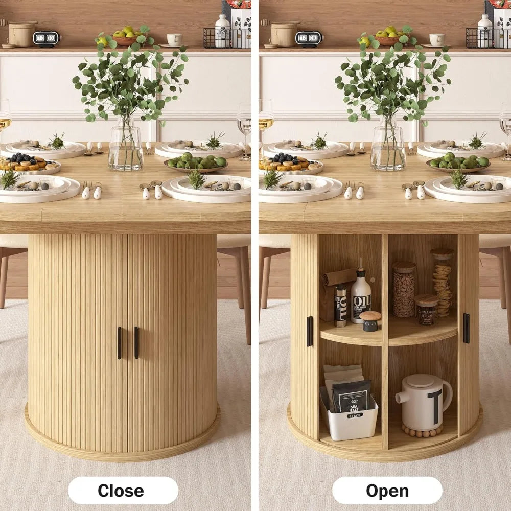 Extendable Dining Table 43-59" for 4-6 People, Solid Wood Top with Fluted Slide Door & 8-Compartment Storage, Space-Saving Desig