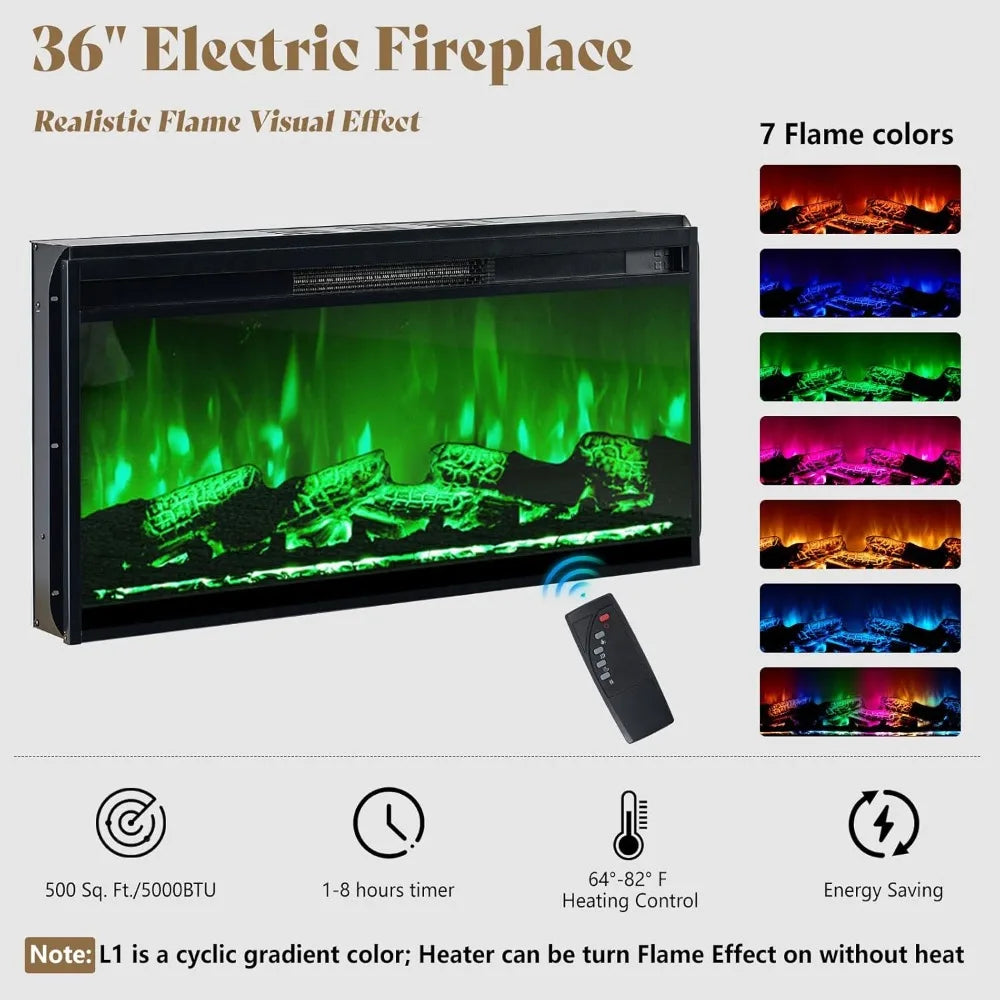 This multi-functional entertainment center is a 98-inch wall unit fireplace TV stand that offers a comprehensive storage solution for your living room or entertainment space. It includes a TV console, bookshelf, wine cabinet, and display shelves. The rustic farmhouse style is accentuated by a natural distressed finish and barn doors, seamlessly fitting into various home decor styles. The built-in 36-inch electric fireplace boasts 7 flame color modes, creating a cozy atmosphere that can be enjoyed with or without heat. It also features a 1H-8H timer setting for safety and energy efficiency. The TV hutch is equipped with a built-in power station, including 3 AC outlets, 1 USB port, and 1 Type-C port, ensuring a seamless connection for TVs, gaming consoles, and smart devices. Cable management is simplified with multiple cable holes. Made from premium MDF wood, the TV media unit comes with 2 anti-tip brackets for safety. The dimensions of the TV cabinet are 98" W x 11.8" D x 77.8" H, and the fireplace measures 36" W x 5" D x 18.07" H. Detailed assembly instructions are included for easy setup, and it is recommended for 2-3 people to assemble within 4-5 hours.