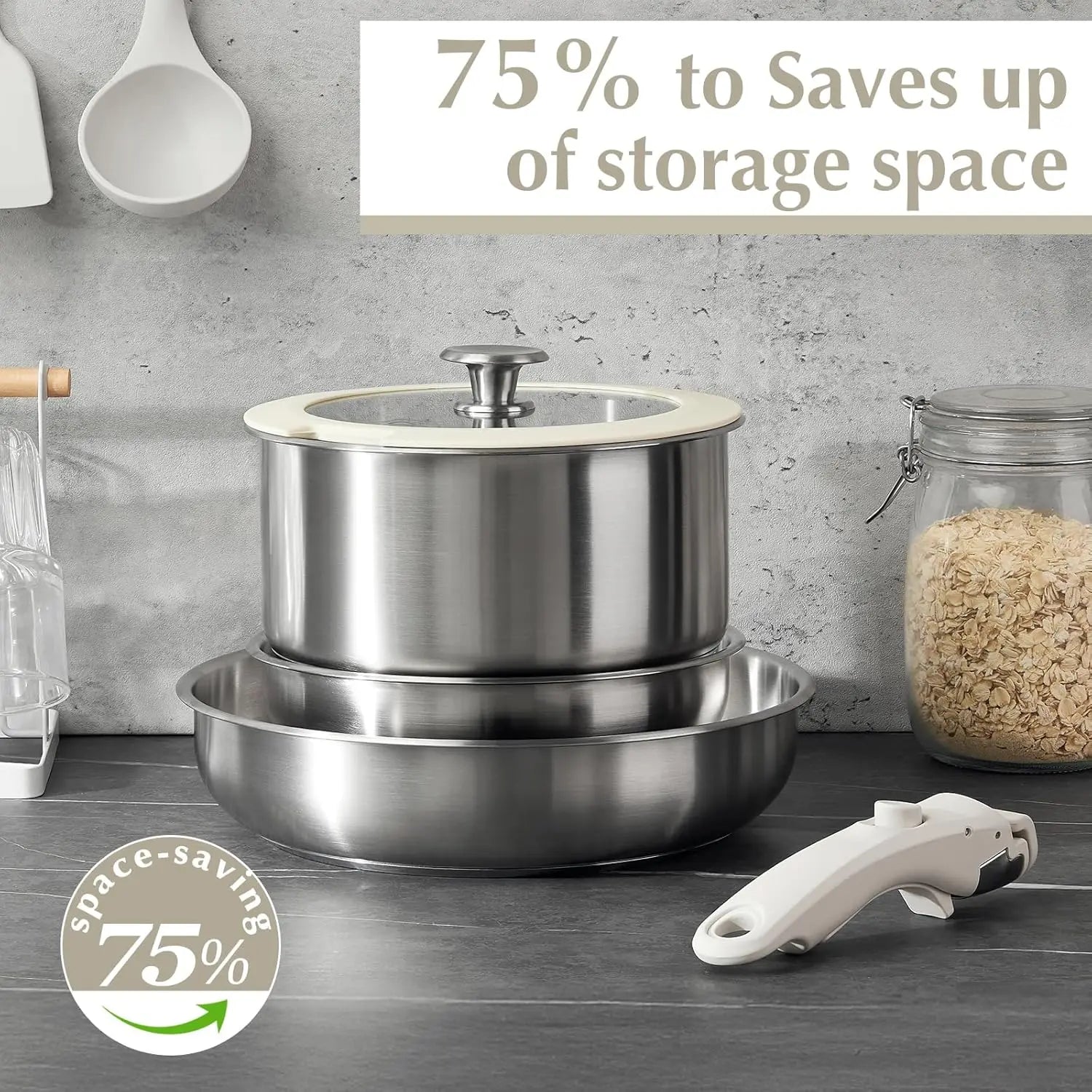 KOCH SYSTEME CS Stainless Steel Pots and Pans Set, 7 Piece Stainless Steel Cookware Set with Detachable Handle