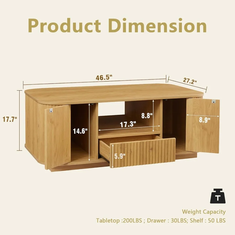 This coffee table is a luxurious and modern piece of furniture that features a unique wavy-shape fluted panel and curved edge design. It easily complements various modern furniture styles and serves as an eye-catching focal point in any room. The wooden construction brings a comfortable atmosphere, making it an ideal addition to your living room. The table offers ample storage space, with dimensions of 46.5 inches wide, 27.2 inches deep, and 17.7 inches high. It includes two storage drawers, an open storage shelf, and four doors that reveal two spacious hidden compartments. These compartments are perfect for storing frequently used items like books, cups, games, and controllers, keeping them dust-free and providing additional storage. Made from high-quality engineered wood and sturdy metal hardware, this mid-century modern table ensures stability and durability. The table's corners are crafted with heavy support wood, preventing deformation or breakage. The doors are designed with a press-spring lock, eliminating the need for handles and creating a seamless, aesthetically pleasing appearance. The coffee table's surface is waterproof and scratch-proof, with a wood texture that makes it more durable than regular rectangular tables. Cleaning is a breeze, as the tabletop only requires a quick wipe with a dry cloth, reducing household chores. When you purchase this table, you can do so with confidence. Clear assembly instructions and labeled parts make the assembly process straightforward. We recommend having a second person to assist for a smoother assembly experience. The product is shipped in a sturdy box with thick foam and wooden protective boards to ensure maximum protection during transportation. Should you encounter any issues during assembly, our professional support team is on hand to provide assistance and ensure your satisfaction.