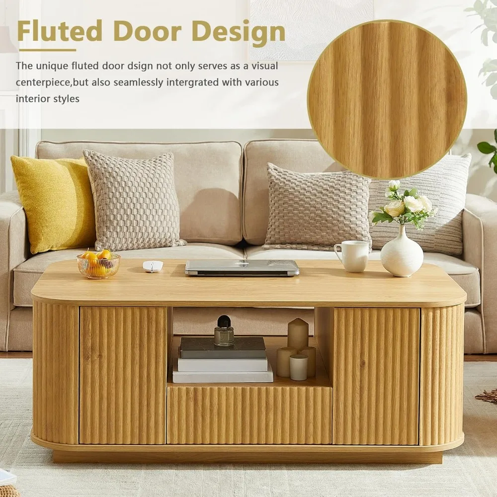 Modern Oval Coffee Table with Storage for Living Room, Fluted Design, 2 Drawers, Open Shelf, and 2 Compartments