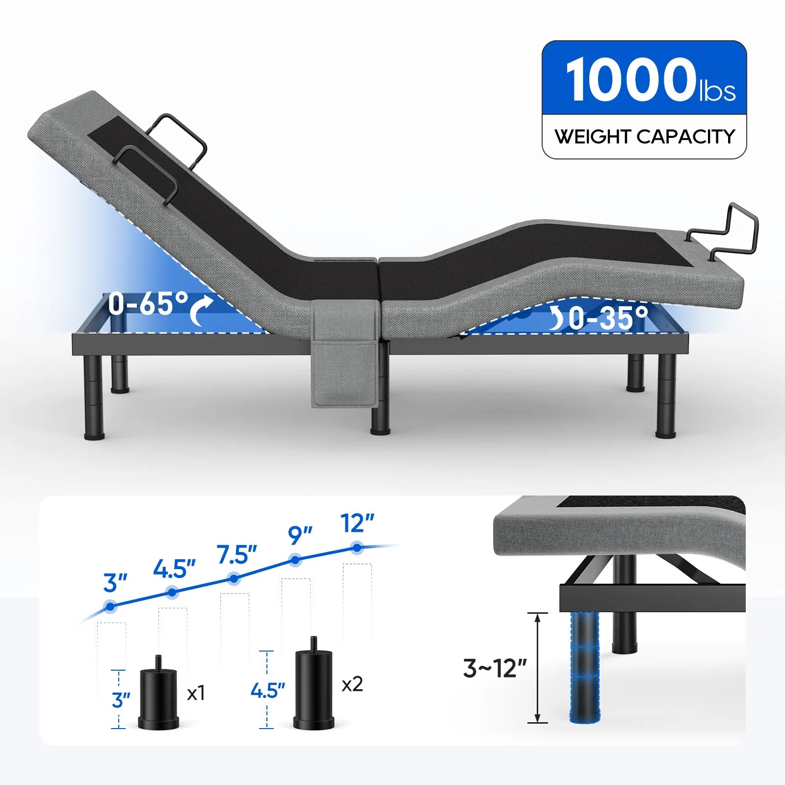 Adjustable Comfort: Dual quiet motors adjust head up to 65° and foot up to 35°, with anti-snore and Zero Gravity preset positions.